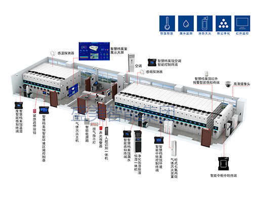 檔案庫房一體化管理總臺 檔案庫房環控管理系統 RFID檔案管理系統 檔案庫房密集架 檔案庫房消防管理系統 檔案庫房安防管理系統 檔案庫房漏水監測子系統 檔案除塵凈化消毒設備 智能檔案選層回轉柜